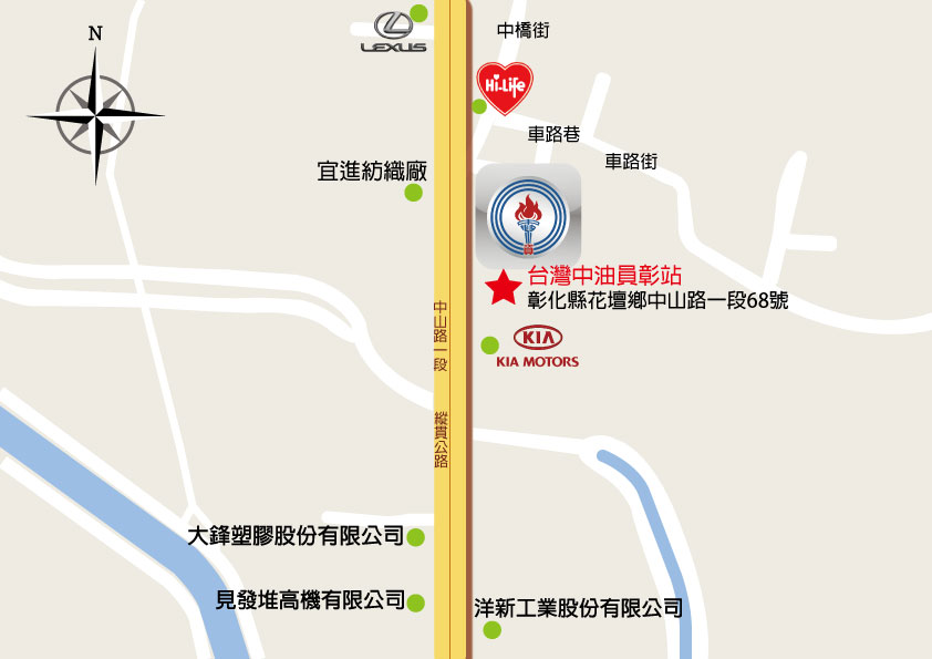 本站位於花壇鄉中庄村省道中山路上,為北上台74甲線中彰外環道之最後一個加油站,與彰化、大村、秀水、芬園等鄉鎮為鄰,方